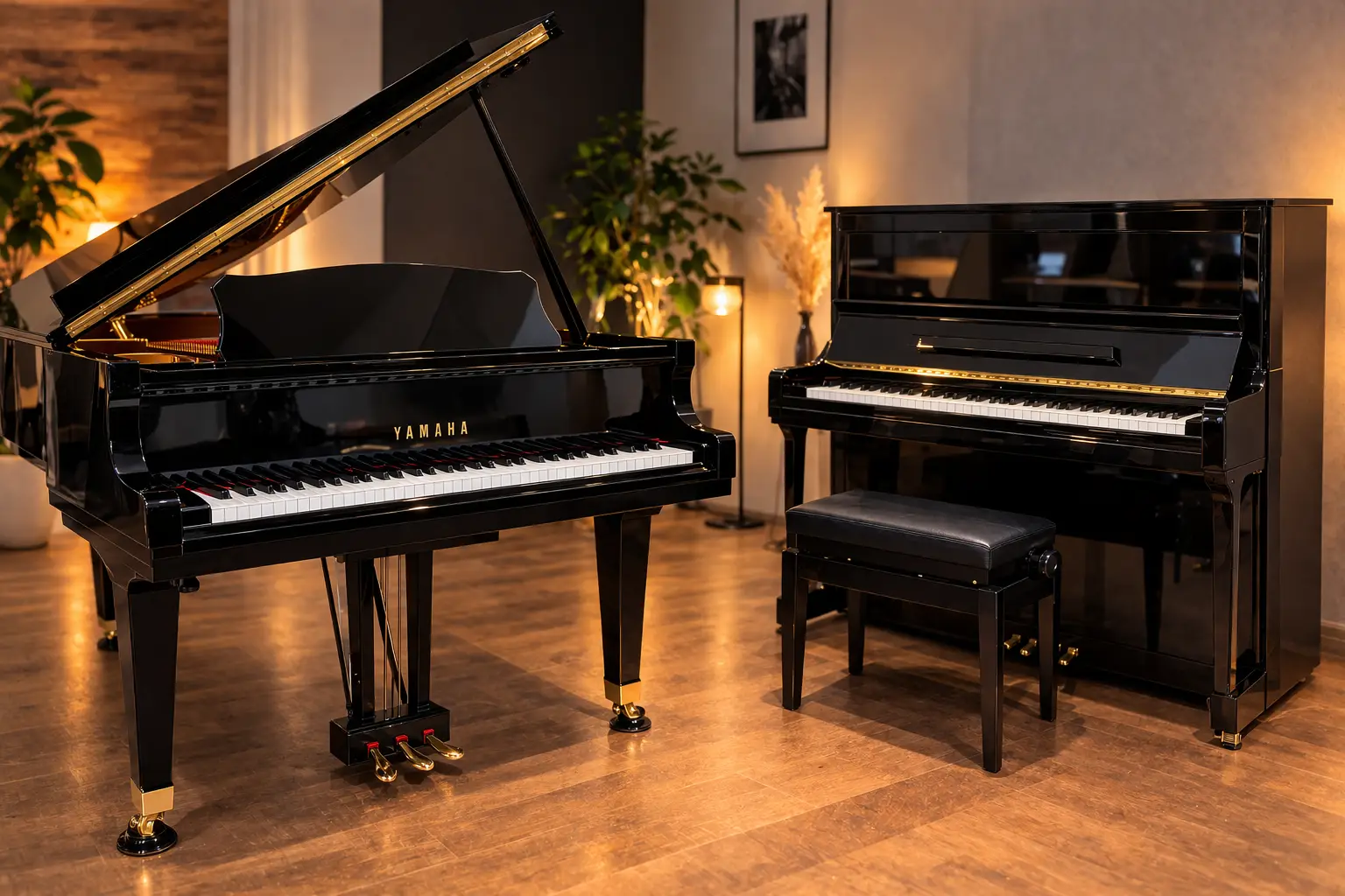 Vergleich zwischen Klavier und Flügel mit schwarzem Yamaha Klavier und braunem Flügel